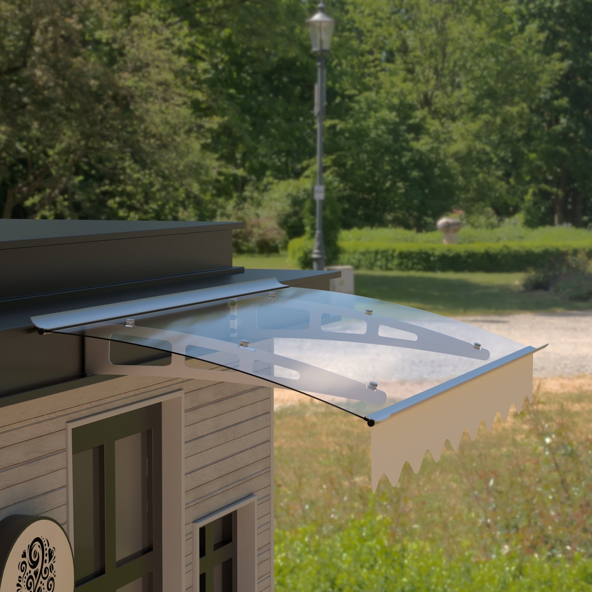 DA4734W Series Door Window Awning Made of 0.137 Inch Thick Crystal Solid Polycarbonate Sheet and Aluminum Alloy with Valance in size of 47" Wide x 34" Deep for Wooden Wall House