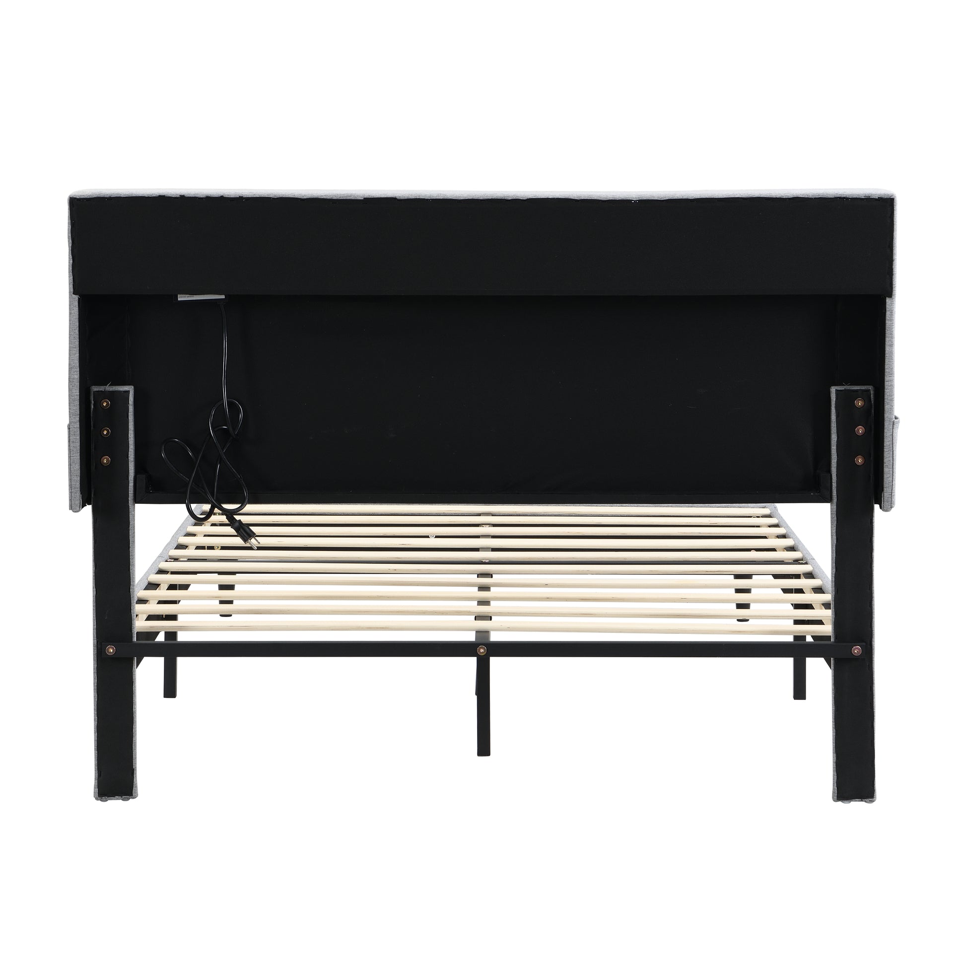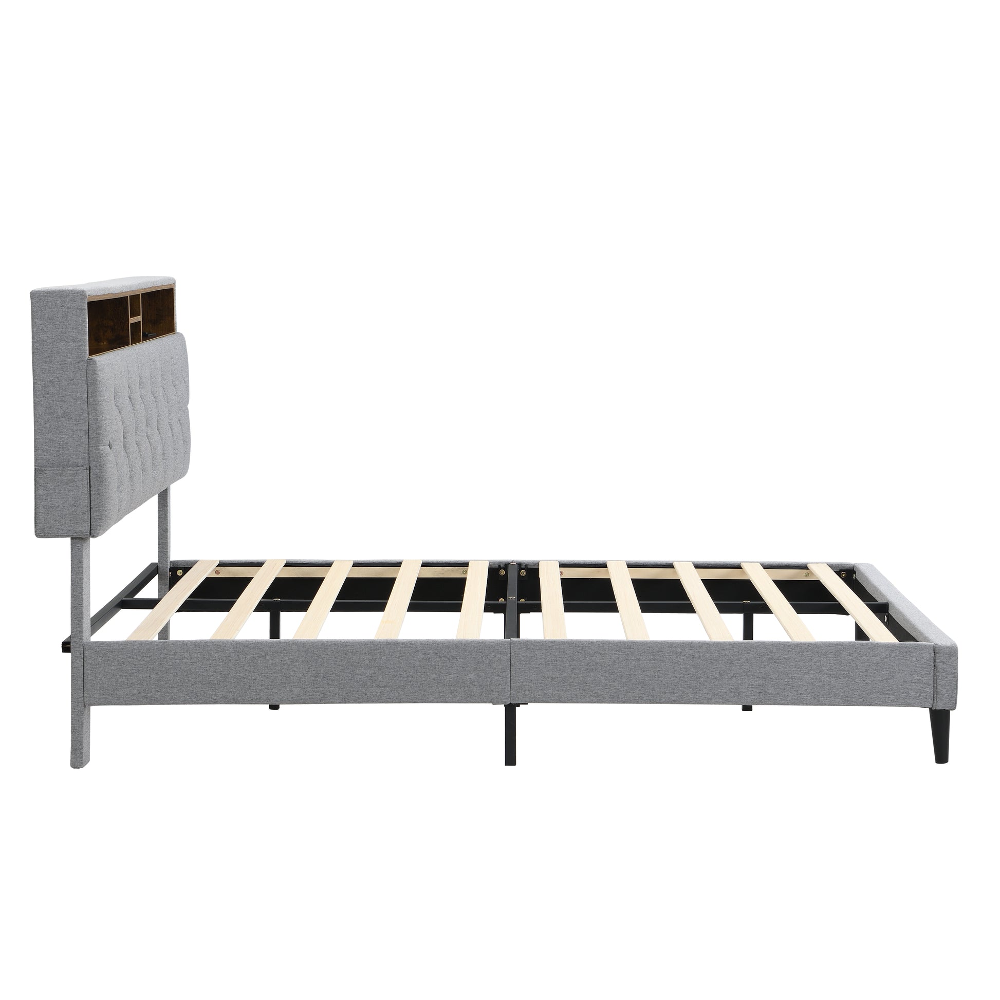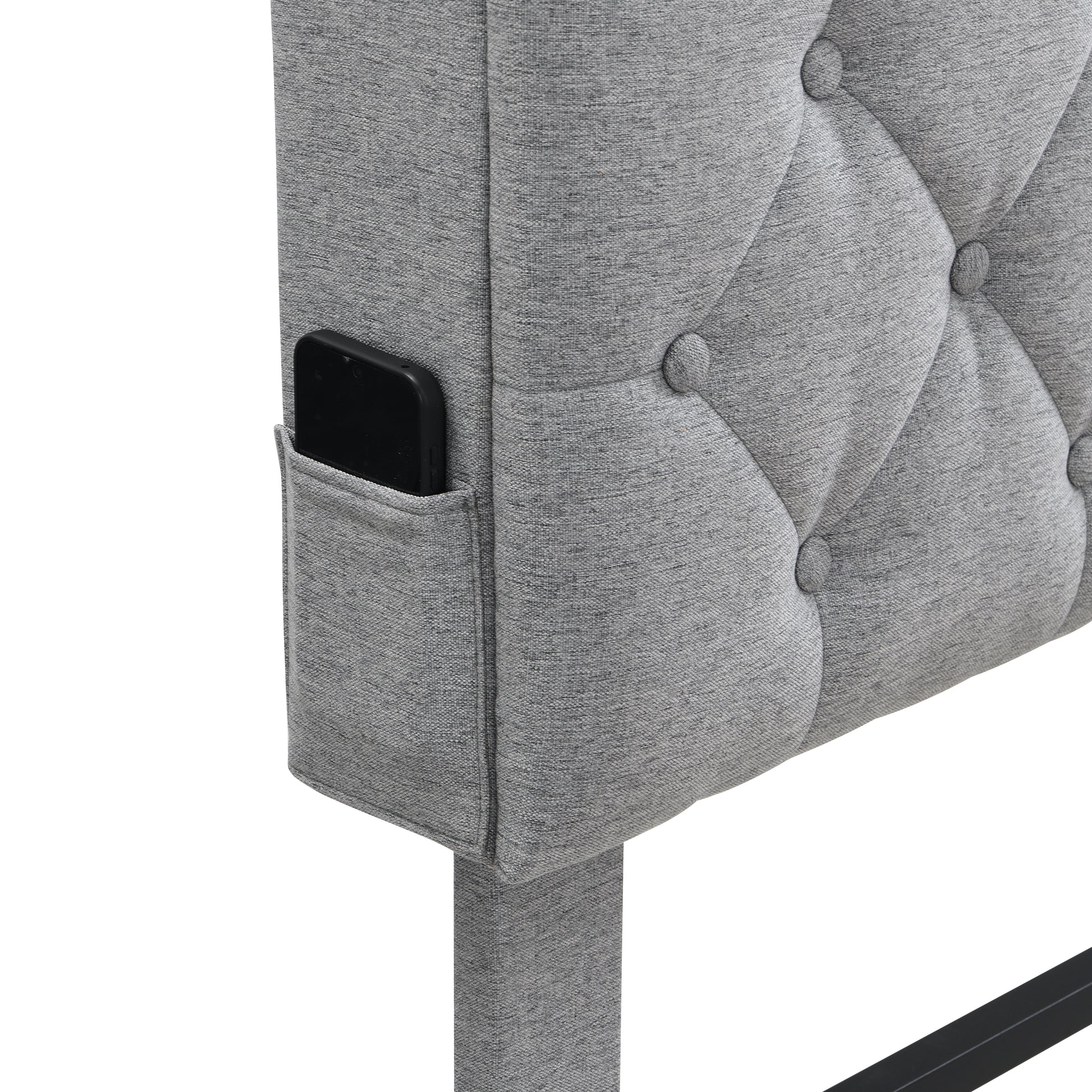 Queen-Size Upholstered Platform Bed Frame with a Modern Button-Tufted Linen Fabric Headboard,USB Ports,Convenient Charging Station,two side-mounted pockets,not require a box spring,Light Grey